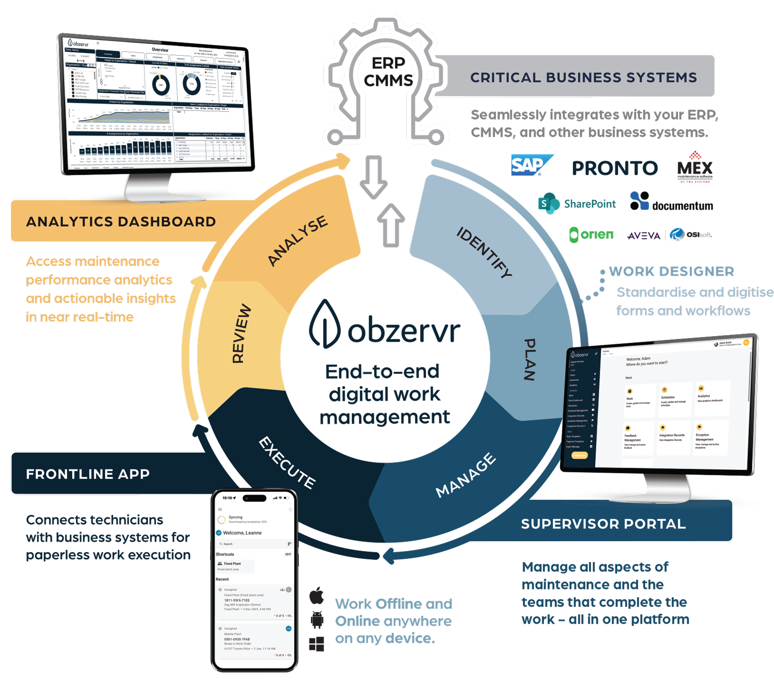 Obzervr is a highly configurable web-based platform and mobile app that seamlessly integrates with your ERP, CMMS, and critical business systems to provide a true end-to-end digital work management solution for maintenance.